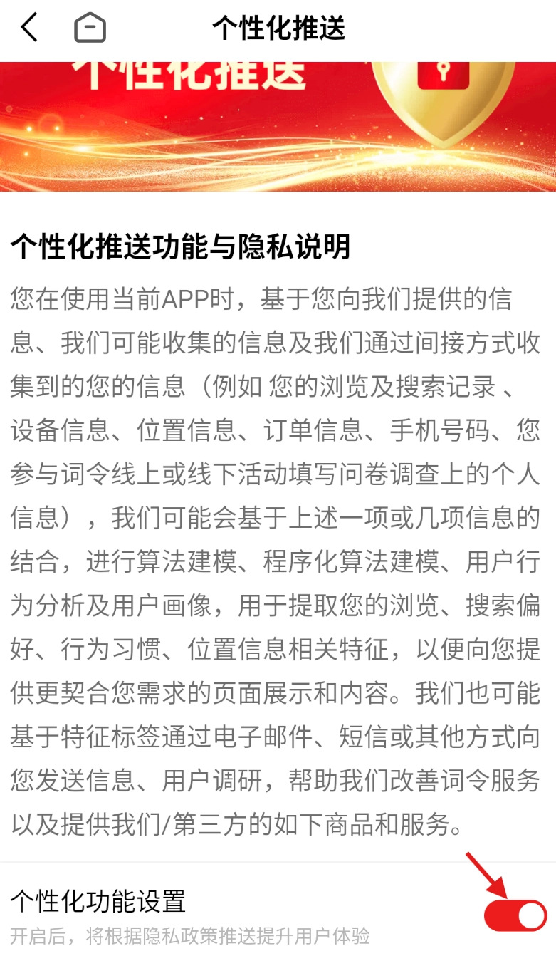 向下滑动页面,找到“个性化功能设置”旁边的开关按钮,点击该按钮就能关闭此功能。