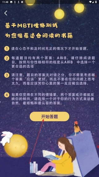 在定制页面点击【开始答题】按钮,就能参与MBTI性格测试啦。