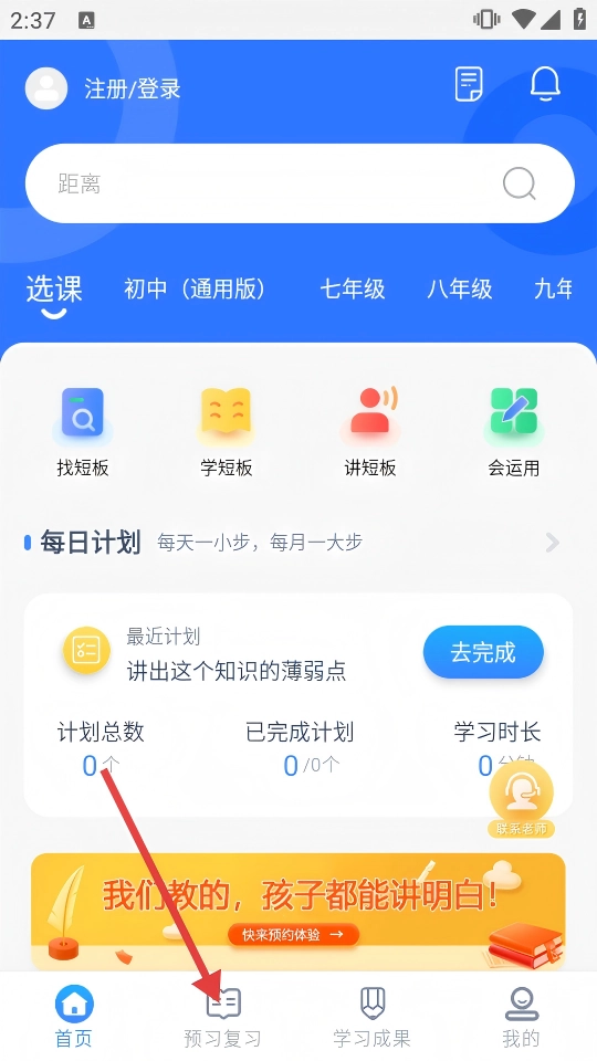 在首页底部找到【预习复习】按钮并点击,随后进入【初中-通用版】的课程选区,即可开启学科学习规划。