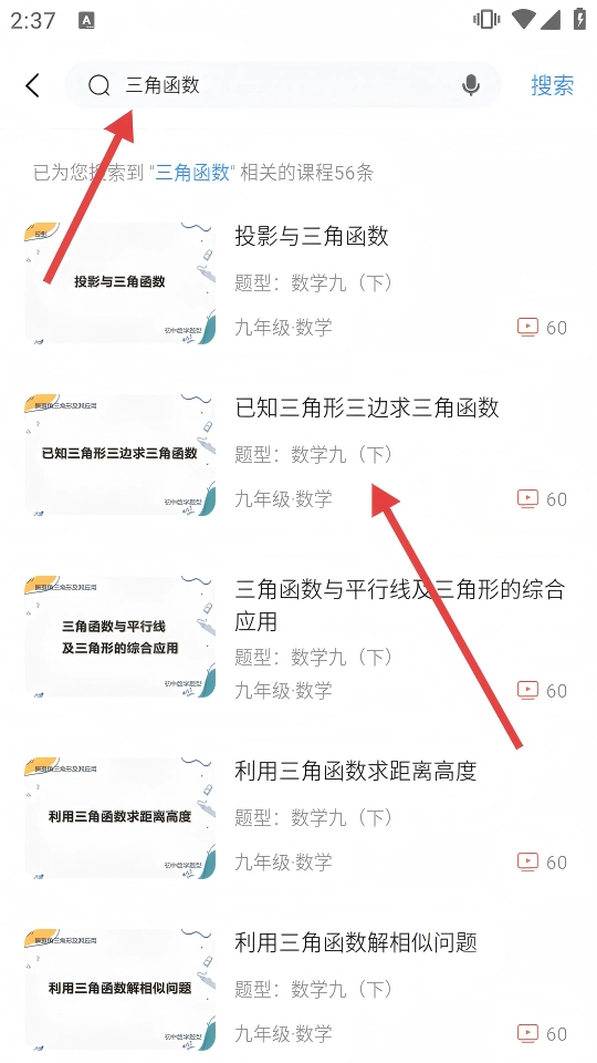 在搜索框中输入“三角函数”,然后从搜索结果里挑选类似“已知三角形三边求三角函数”这样的课程,进行深入学习。
