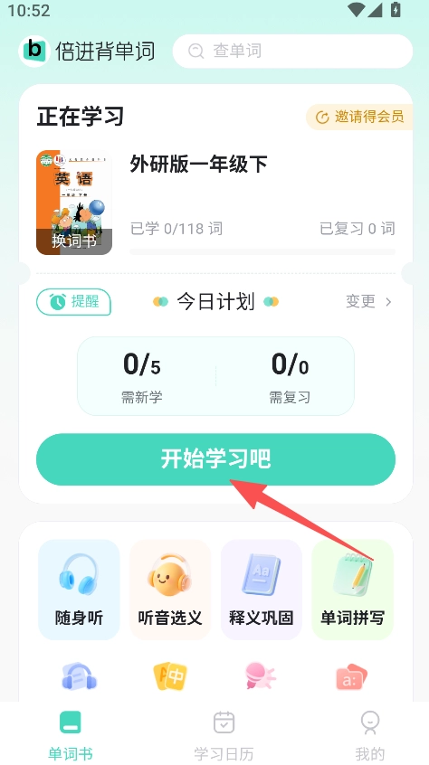 打开软件后,先挑选合适的单词书,接着点击“开始学习吧”按钮,这样就能进入学习界面了。