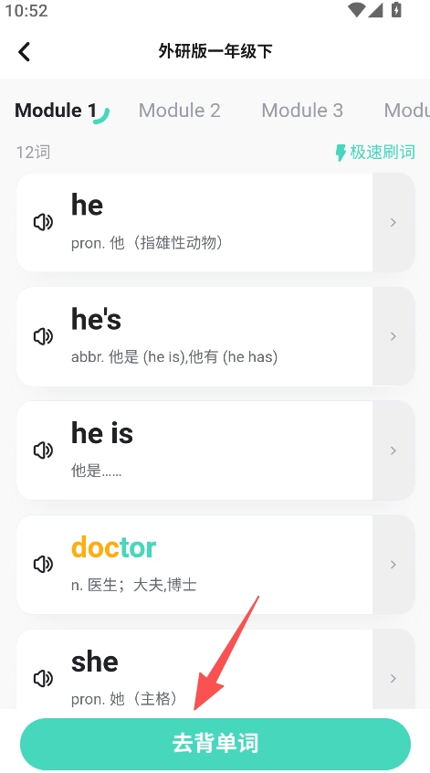 进入模块,点击去背单词,开始单词学习。