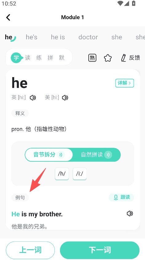 单词详情十分丰富,涵盖发音、释义、例句与音节拆分等内容,从多个维度对单词进行解析,帮助学生深入透彻地理解单词。