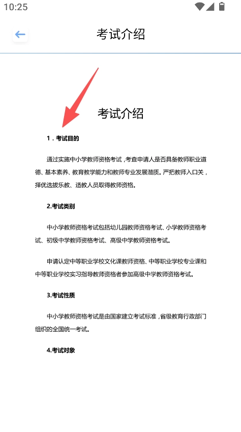 该功能包含考试介绍模块,考生可通过它查看考试目的、类别等相关信息,从而对教师资格考试形成全面的认知。
