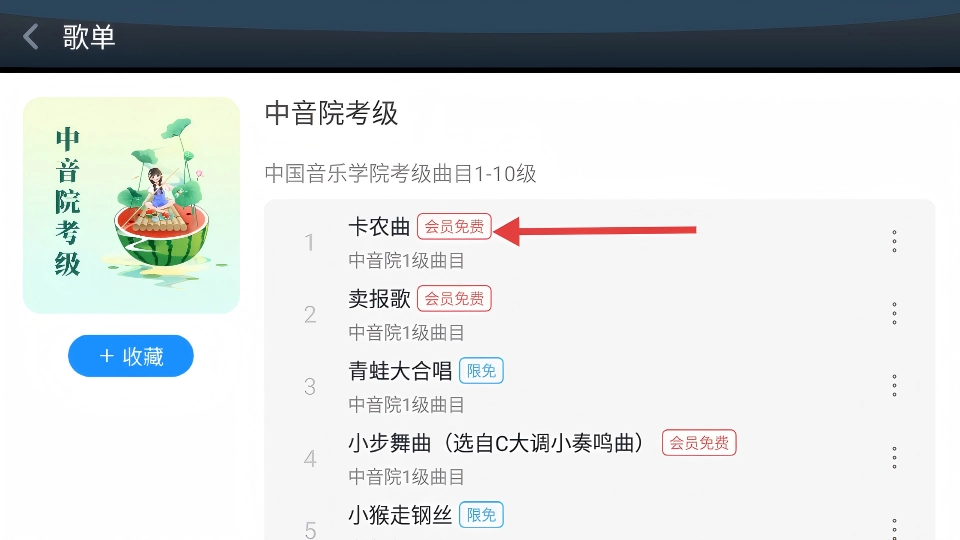 在曲库页面,点击【中音院考级】这个歌单,就能进入到它的详情页面了。
