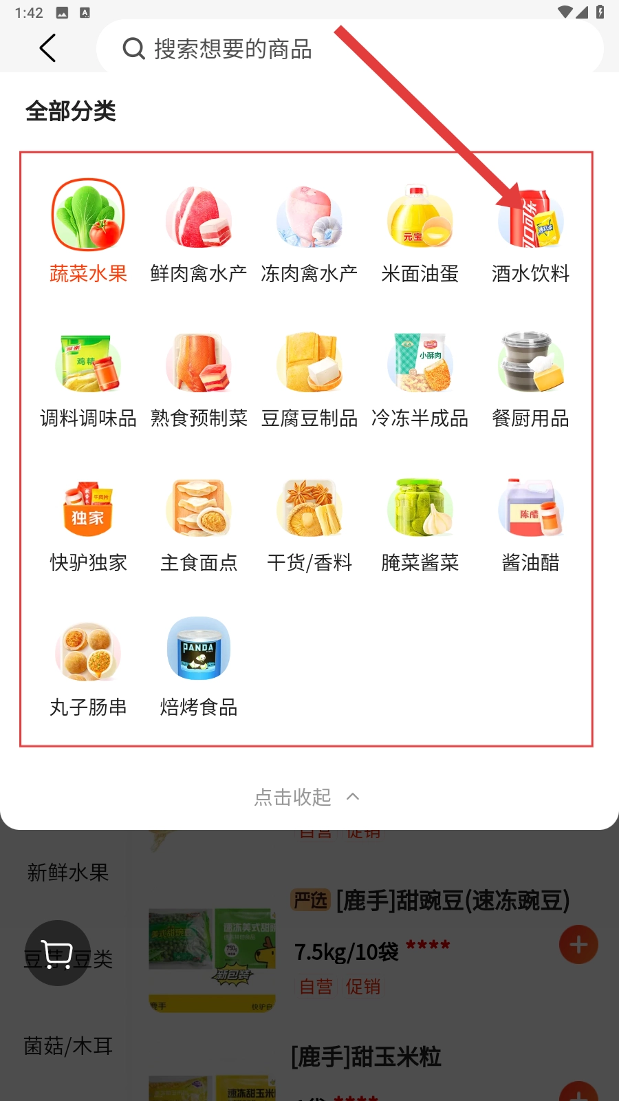 点击搜索栏旁边的分类选项,展开完整的【分类】列表,选择对应的品类并点击进入。
