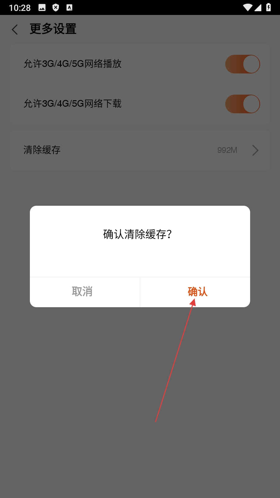 在更多设置页面,点击【清除缓存】选项后,会弹出确认是否清除缓存的弹窗。