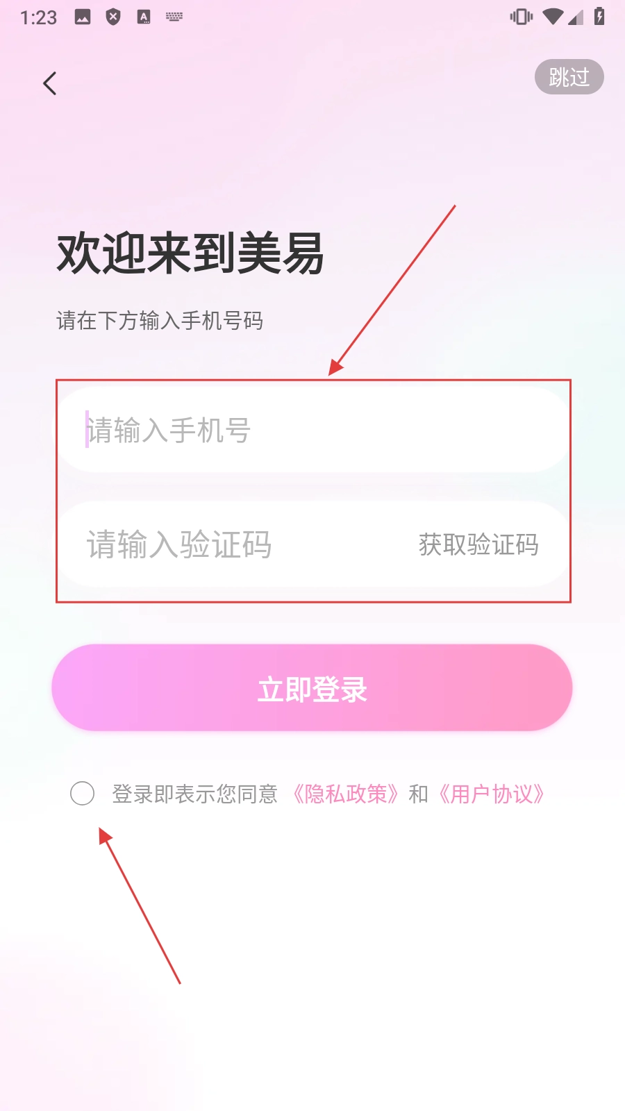 在信息填写界面,输入手机号码、验证码并勾选同意协议,完成登录前的准备。