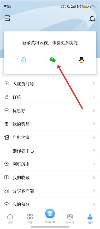 在【我的】页面,选择【微信】图标登录黄河云视吧。