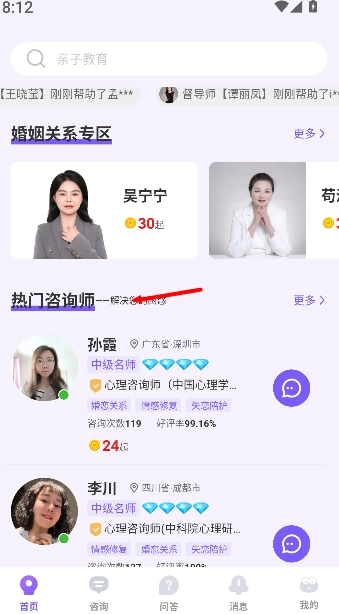打开软件首页后,你可以浏览热门咨询师的列表,从中了解每位导师的个人简介以及他们各自擅长的领域。