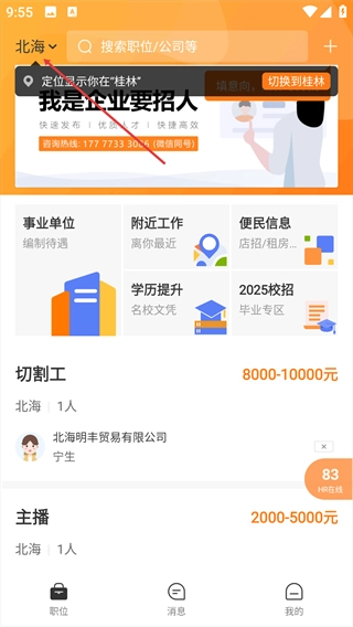 城市切换后,页面将展示该城市的岗位信息。