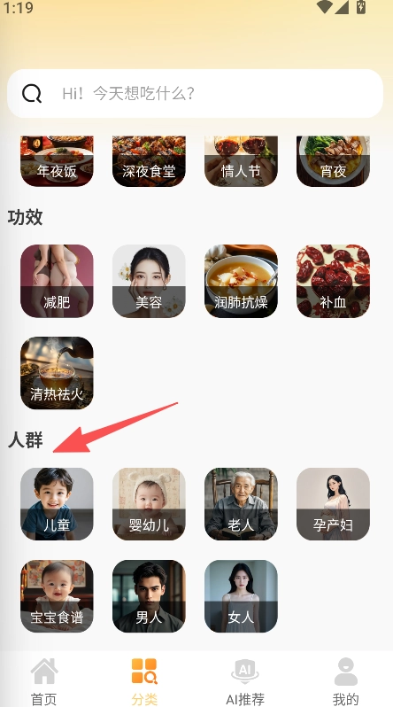 支持人群分类筛选功能,在分类页面点击儿童等人群分类选项,就能进入相应的菜谱展示页面。