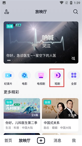进入【放映厅】页面后,能看到分类选项,点击【短剧】分类,可进入对应的短剧内容浏览界面。