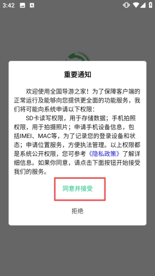 打开软件后会弹出【重要通知】窗口,此时点击【同意并接受】按钮,即可允许软件获取相关权限,确保各项功能能够正常使用。