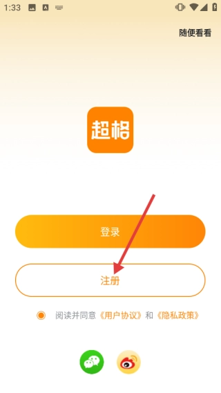 打开超格软件后,在登录页面找到并点击【注册】按钮,即可进入注册流程。