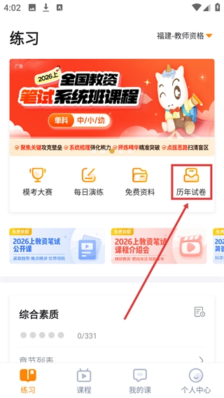 在【练习】页面中,找到功能入口内的【历年试卷】选项并点击,即可进入相应板块查看各类考试试卷。