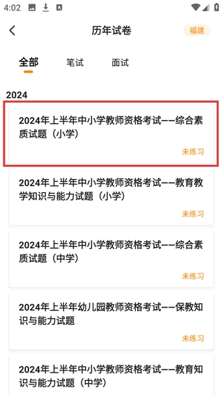 进入【历年试卷】页面后,找到【2024年上半年中小学教师资格考试--综合素质试题(小学)】这一条目,点击该条目即可进入答题页面。
