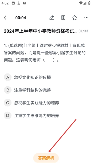 进入试题答题页面后,即可开始解答题目;完成作答后,在页面中找到【答案解析】按钮,点击该按钮就能查看对应的题目解析内容。