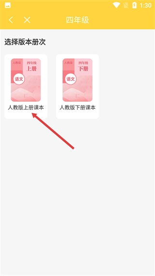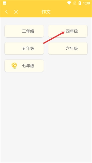 进入作文的年级选择页面后,点击【四年级】选项,选定该年级,随后进入版本册次的选择界面。