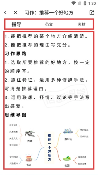 在这篇习作的指导页面,你可以查看习作要求、写作思路以及思维导图,利用这些内容来帮助完成“推荐一个好地方”的作文创作。