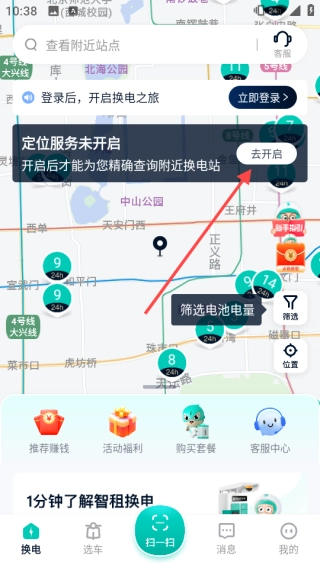 打开软件后,若弹出【定位服务未开启】的提示,可点击【去开启】按钮,这样就能更精准地查找附近的换电站了。