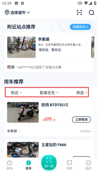 进入选车界面后,借助【附近】【距离优先】【筛选】等功能,可以更高效地找到符合需求的车辆。
