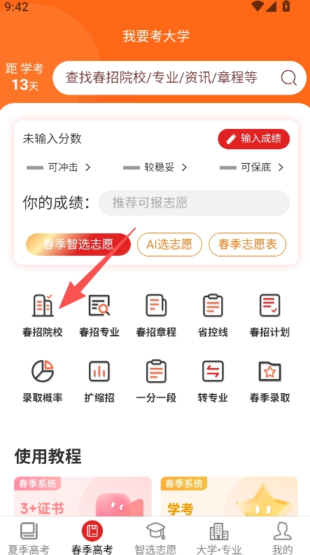 《我要考大学》作为一款助力高考志愿填报的辅助软件,具备学考倒计时显示功能,设有成绩输入板块,能将志愿划分为可冲击、较稳妥、可保底三类,同时包含春招院校专业章程等功能入口。该软件支持按地区、科类、批次类型筛选院校,还可查看院校的院系设置及专业详情,全面覆盖志愿填报过程中的信息查询需求,操作界面清晰直观,能够有效帮助考生进行高考志愿规划。