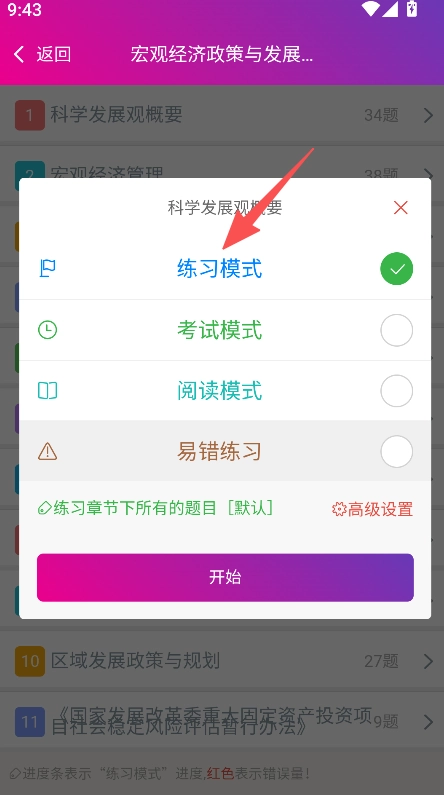 支持练习模式的选择功能,在章节练习页面,选定对应内容后即可选择所需的模式。
