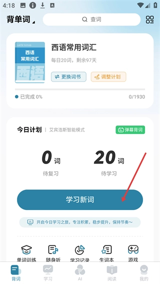 进入背单词页面后,先确认【西语常用词汇】词书的今日学习计划,再点击【学习新词】按钮,即可进入待学单词列表。