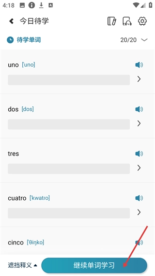 在今日待学页面,点击底部的【继续单词学习】按钮,即可进入学习设置界面。