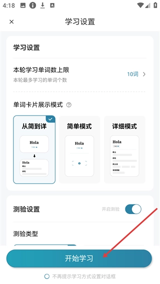 在学习设置页面选定卡片模式后,点击【开始学习】按钮即可进入单词学习界面。