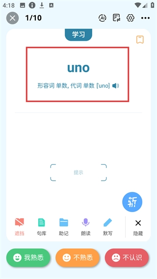 进入单词学习页面后,查看【uno】的词性和发音信息,还能借助【我熟悉】这类按钮来标记自己对这个单词的掌握情况。