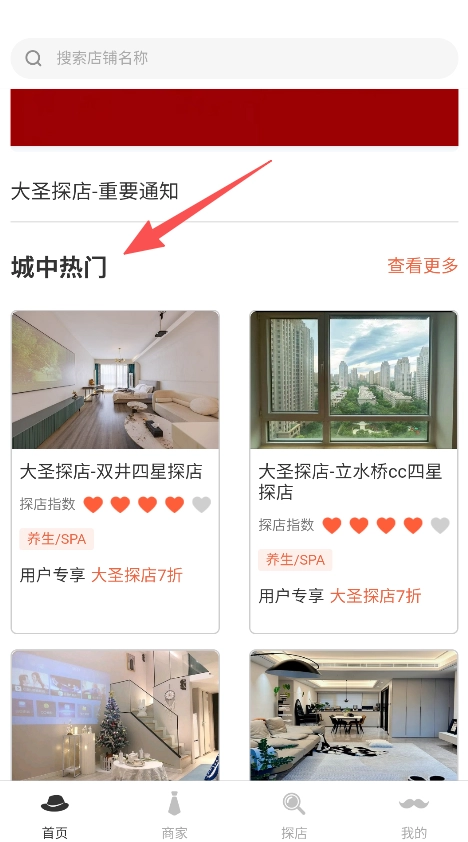 打开大圣探店APP进入首页后,点击“城中热门”板块,即可查看探店信息列表。