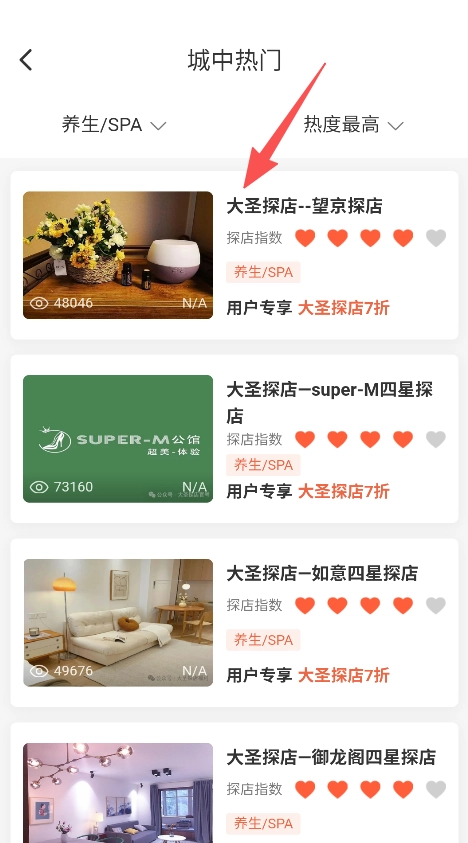 我们提供探店列表查看功能,您可以进入首页的城中热门板块,查看养生/SPA类等本地探店信息列表内容。