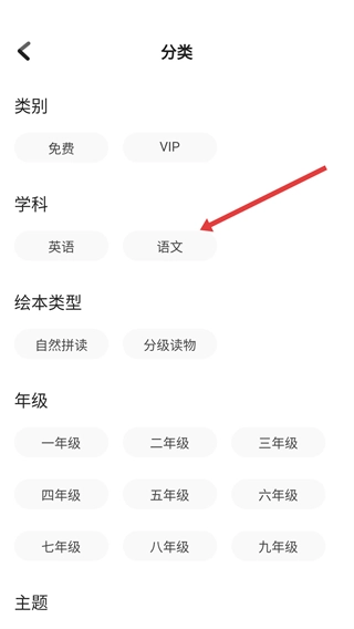 在分类页,选择【语文】学科来筛选对应内容呀。