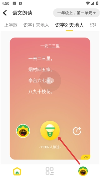 选好内容后,像【识字2天地人】这类,点击麦克风按钮就能开始朗读练习了。