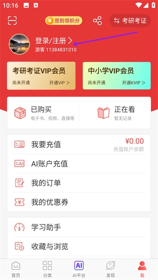 点击页面顶部的【登录/注册】入口。