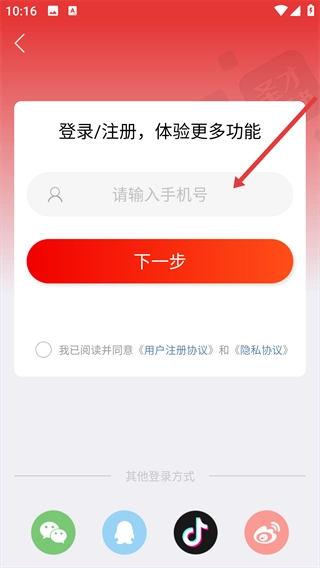 进入登录或注册页面,在输入框内填写手机号码,接着点击【下一步】按钮。