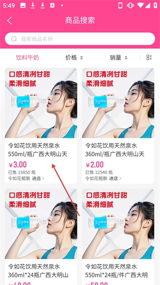 在饮料牛奶类商品的搜索页面,找到并点击【令如花饮用天然泉水550ml/瓶】这个商品,即可进入其详情页面。