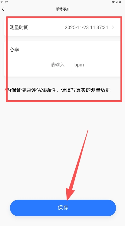 在手动添加页面输入心率数值,最后点击“保存”按钮完成记录。