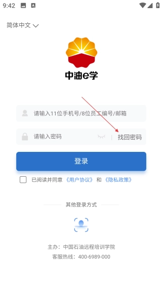 在中油e学的登录页面,点击【找回密码】按钮,即可进入密码找回的信息填写界面。