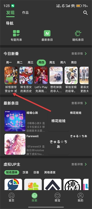 在探索页面的【今日新番】区域,挑选你感兴趣的内容条目,比如【妖怪旅馆营业中】,点击该条目就能进入对应的详情页面了。
