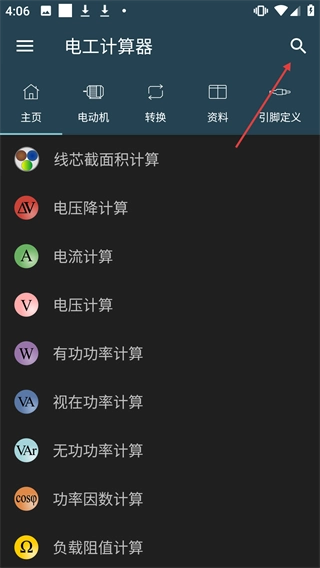 在【电工计算器】主界面点击右上角的搜索图标,即可进入搜索页面。
