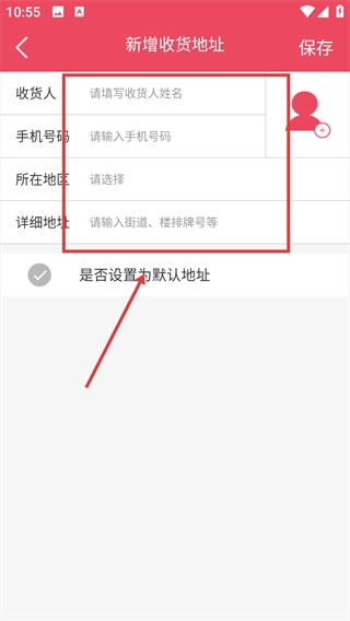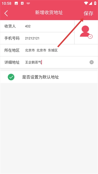 在地址信息填写完毕后,点击页面右上角的【保存】按钮,就能完成收货地址的添加流程。