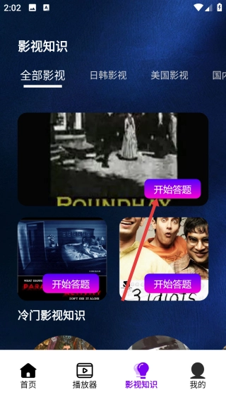 在影视知识相关界面中,找到并点击【开始答题】按钮,即可进入答题页面。