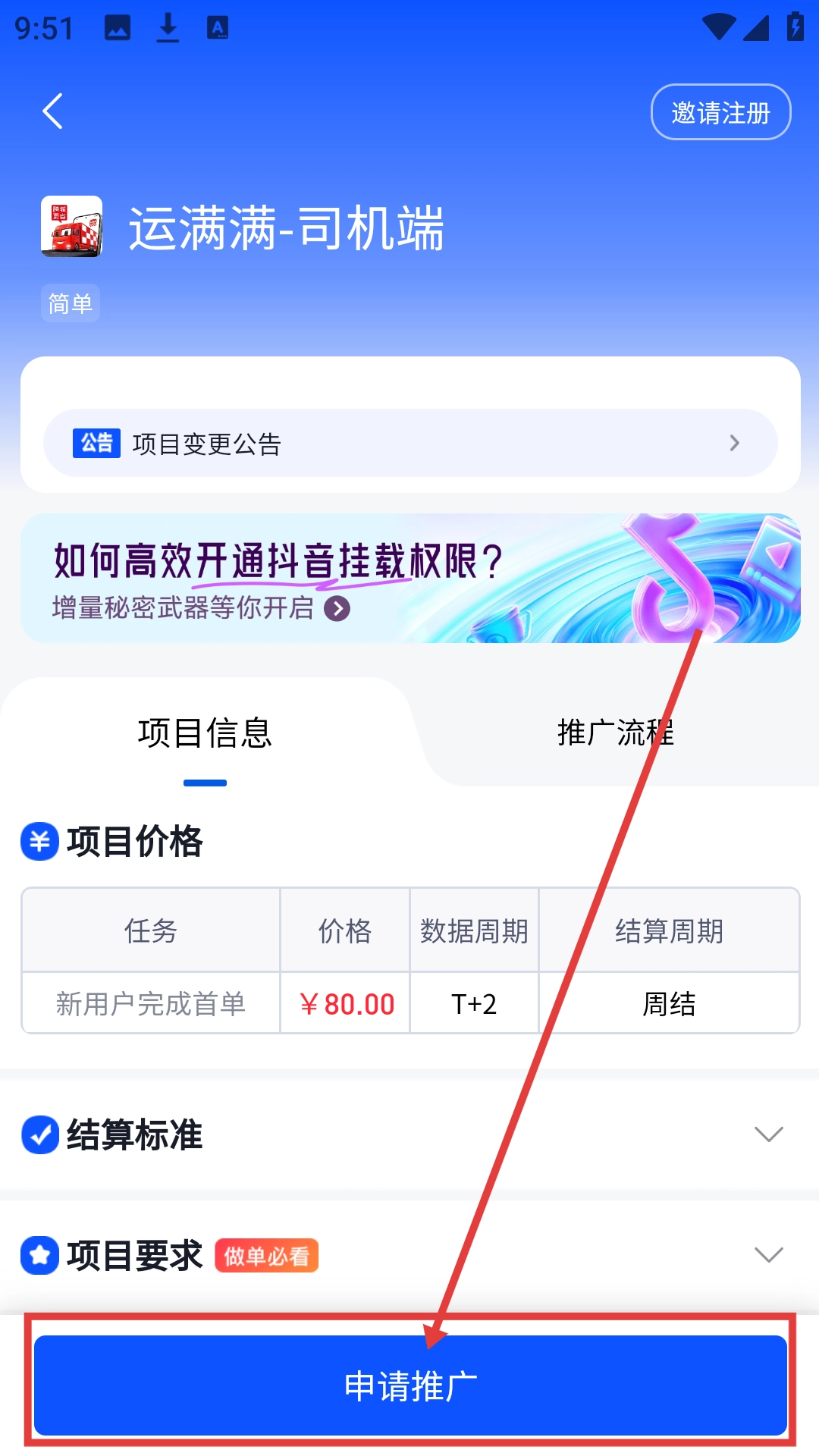 进入新上线项目列表页面后,你可以浏览多个推广项目,挑选自己感兴趣的项目(比如【运满满-司机端】),然后点击进入项目详情页。