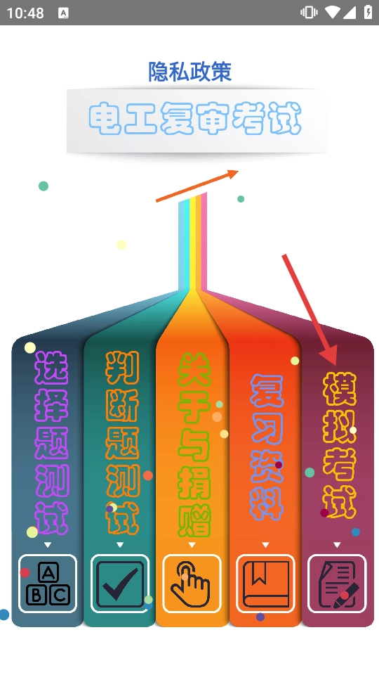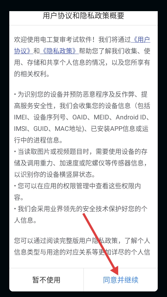 点击【同意并继续】按钮,即表示您接受【用户协议】与【隐私政策】,随后将启动电工复审考试软件的使用流程。