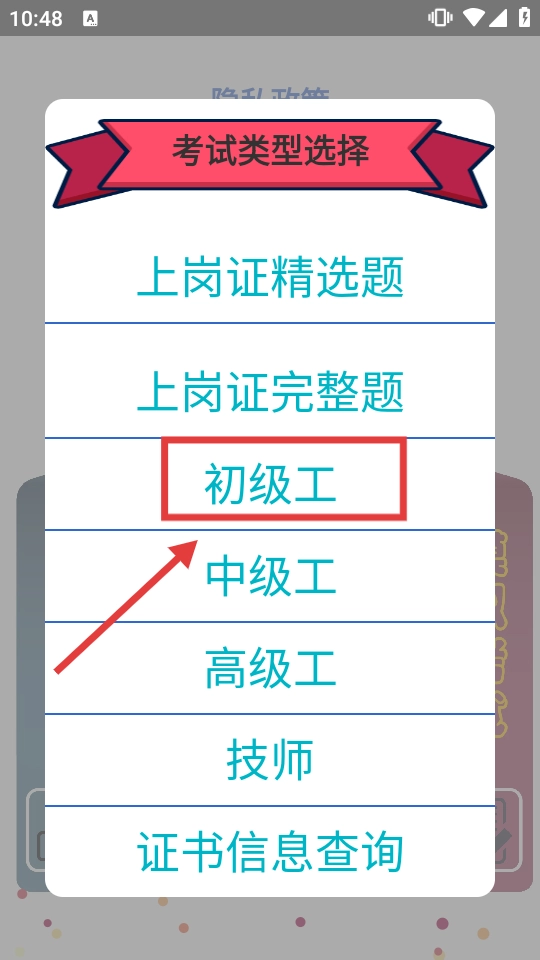 在【考试类型选择】板块里点击【初级工】选项,先把备考的层级确定下来,这样就能更有针对性地进行电工复审的复习工作了。