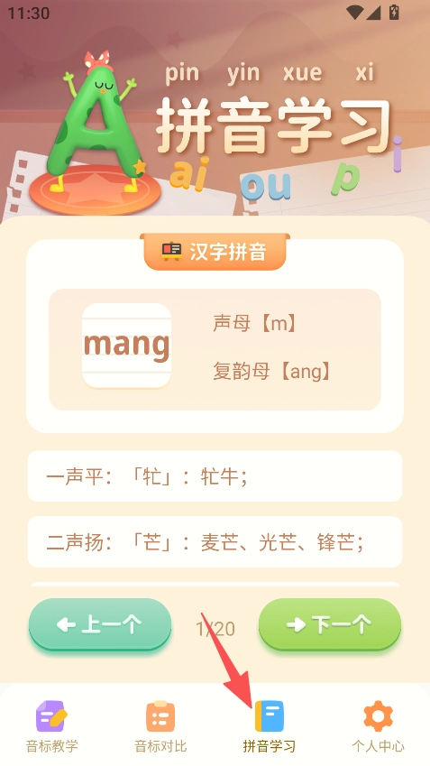 它拥有多模块教学的能力,从拼音入门学习,到拼音与音标的对比解析,再到音标的系统教学,实现了全方位的覆盖,从而搭建起一套完整的拼音学习框架,帮助学习者能够系统性地掌握拼音相关知识。