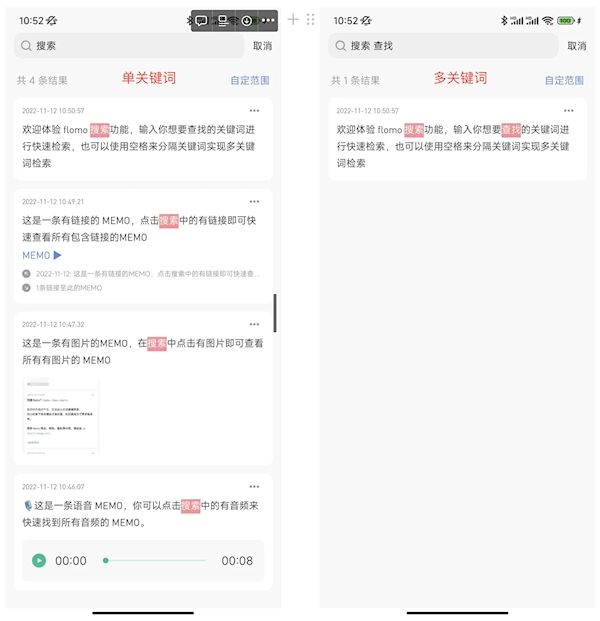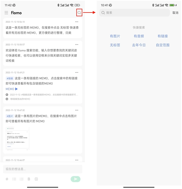 点击快捷搜索按钮后,搜索界面会随即启动;接着点击上方的文本框,输入文字即可搜索MEMO里的文字或标签;若需多关键词检索,用空格分隔关键词即可实现。